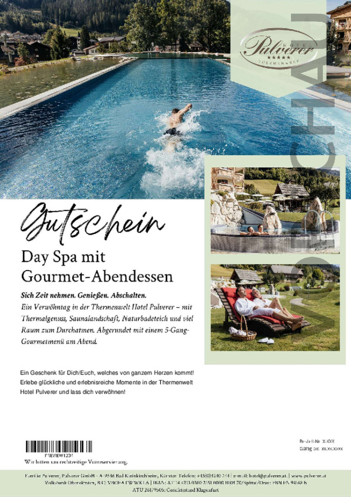 Schenken Sie entspannungssuchenden Gourmets einen Tag voller Wohlbefinden – mit Thermengenuss, Saunavielfalt und einem abendlichen 5-Gänge-Menü aus unserer Haubenküche. Ob als Geschenk für andere oder kleine Auszeit für sich selbst: Dieses Arrangement verbindet Erholung und Kulinarik auf köstlichste Weise. Im Gutschein enthalten: ✔ Thermenvergnügen von 07:00–19:30 Uhr – Thermalhallenbad & Außenbecken – Beheiztes Thermal-Infinitybecken (7 × 25 m), Whirlpool auf 2 Ebenen – Naturbadeteich mit 1.200 m² Wasserfläche (Sommer) ✔ Saunalandschaft von 14:00–19:30 Uhr – 10 Saunen & Dampfbäder – u. a. Kräuter-, Zirben-, Aroma-, Salzstein- & Troadkast’n-Sauna im Freien ✔ 5-Gänge-Wahlmenü am Abend – Aus unserer 2-Hauben-Küche mit Kärntner & internationalen Spezialitäten ✔ Weitere Inklusivleistungen: – Flauschiger Bademantel & Handtücher – Teebar für zwischendurch – Cardio- & Fitnessraum mit PRECOR-Geräten – Lichtdurchflutete Ruheräume & 7.600 m² Gartenanlage – Kosmetik- & Massageangebote in der Vital-Oase (gegen Aufpreis & Voranmeldung)